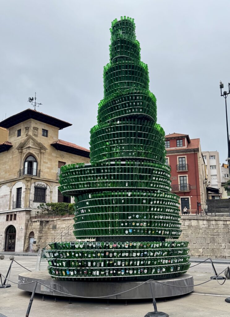 Zurück an der Touristeninformation fällt sofort eine moderne, leuchtend grüne Skulptur ins Auge: der Apfelweinbaum „El Árbol de la Sidra“, zusammengesetzt aus 3.200 leeren Sidra-Flaschen. Er steht stellvertretend für das Lieblingsgetränk der Asturier – den Cidra, einen leicht säuerlichen Apfelwein, der traditionell aus großer Höhe eingeschenkt wird, um ihn zu belüften.