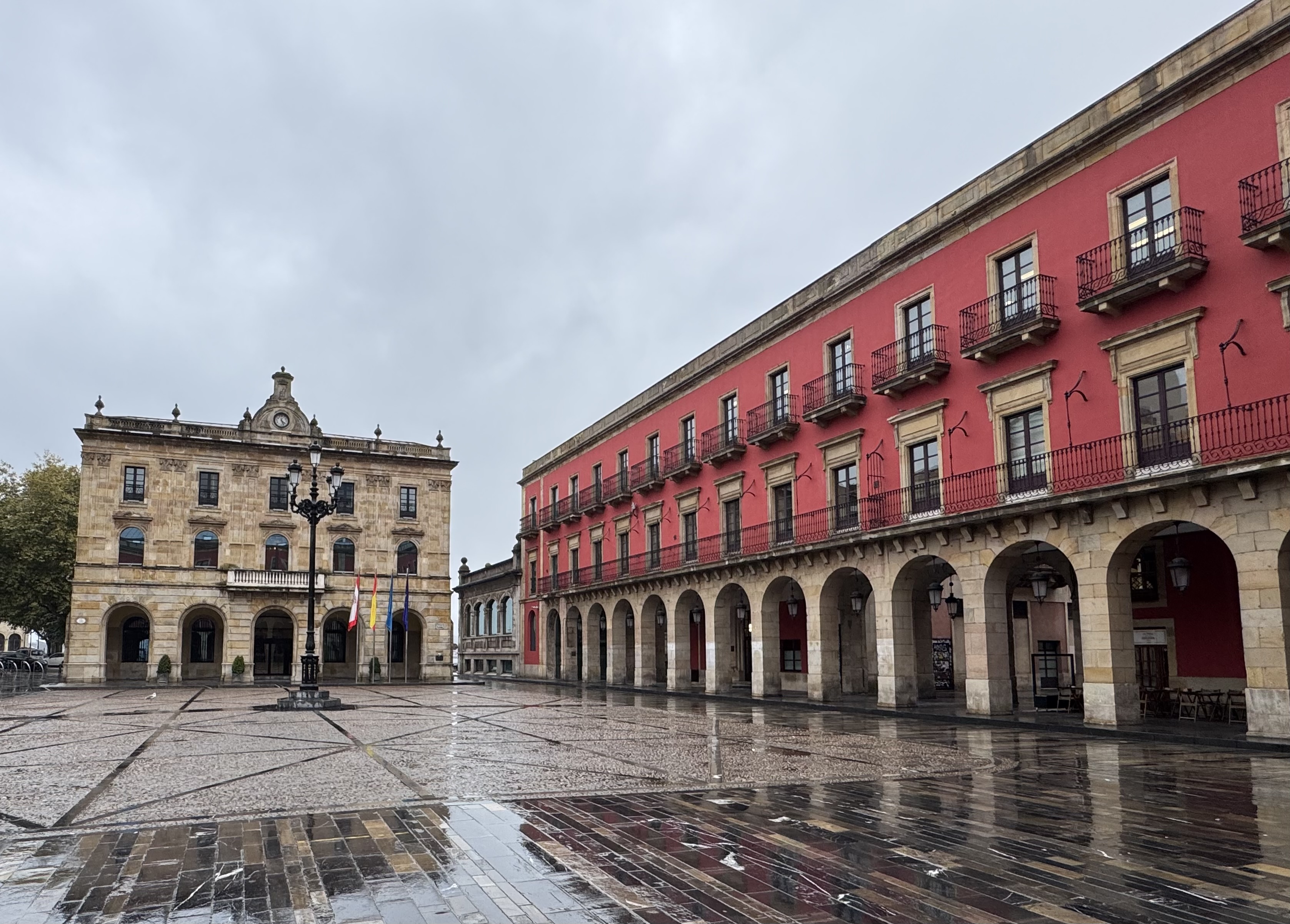 Wenn man nun aus dieser Perspektive nach links blickt, öffnet sich durch ein Tor der Blick auf die Plaza Mayor, den Hauptplatz Gijóns, der mit seinen Arkaden und dem symmetrischen Aufbau sofort ins Auge fällt. Seit 1867 steht hier das Rathaus der Stadt.