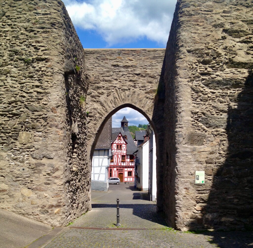 Die Sonne zeigt sich von ihrer besten Seite. Ich wandere an der Loreley vorbei. Felder und Wiesen leiten mich schließlich nach Bacharach, ein Bilderbuchdorf mit weißen Fachwerkhäusern aus dem 16. und 17. Jahrhundert.