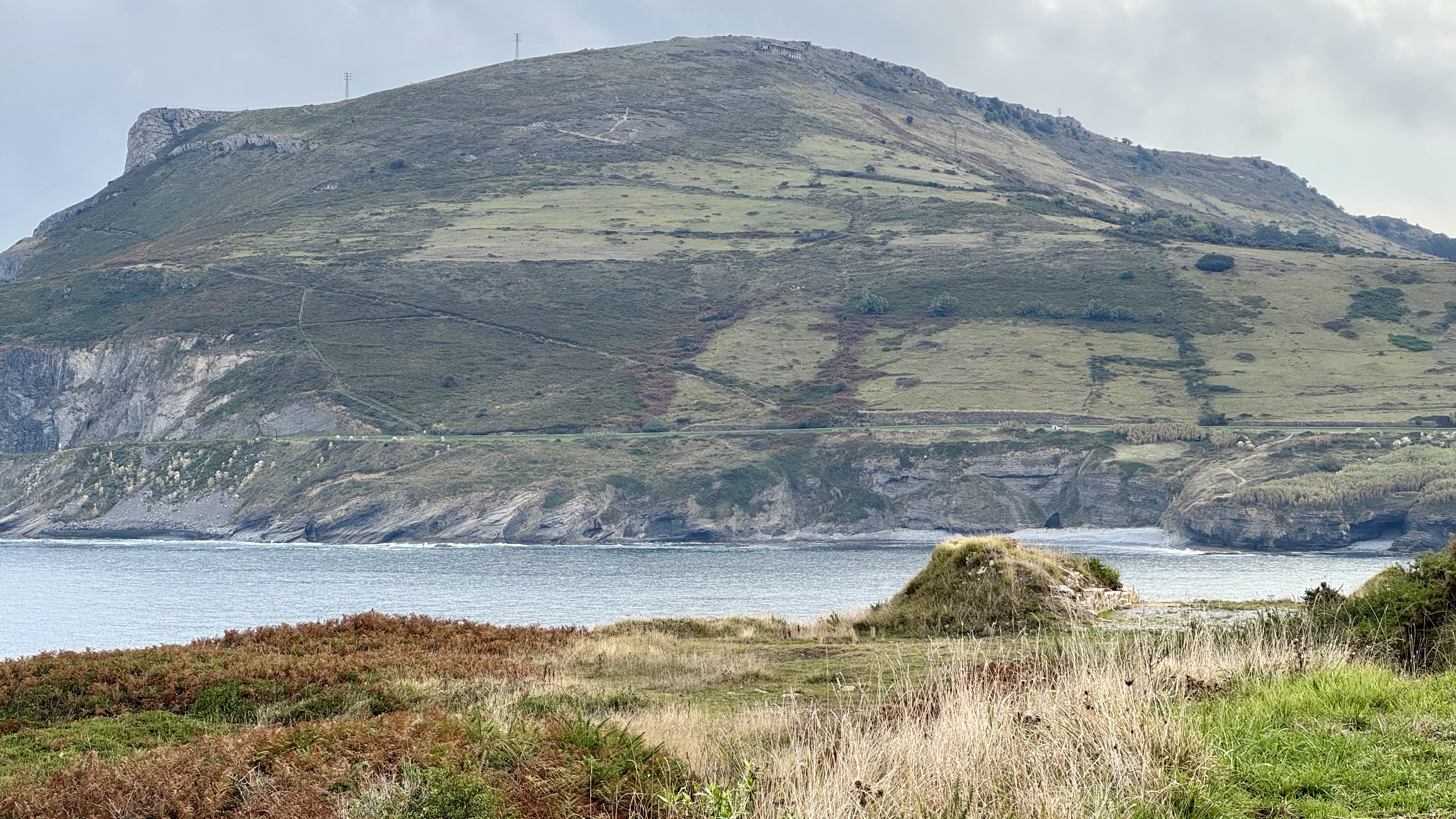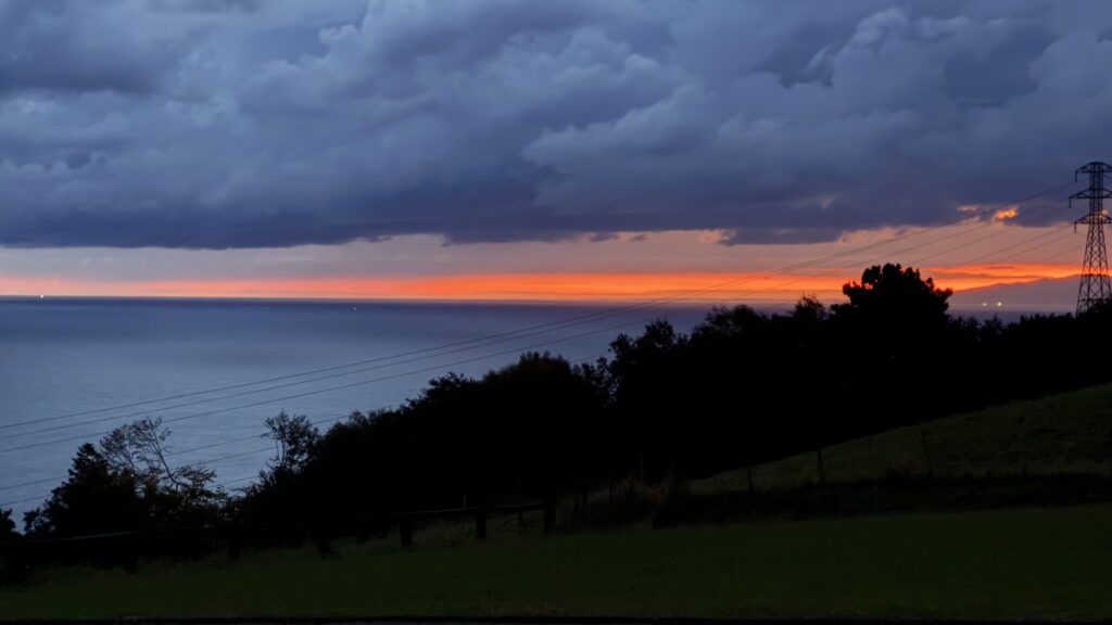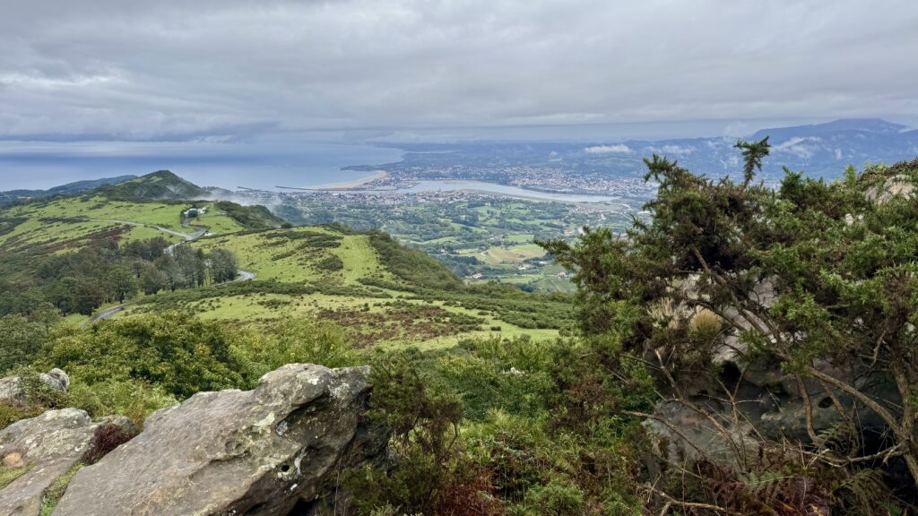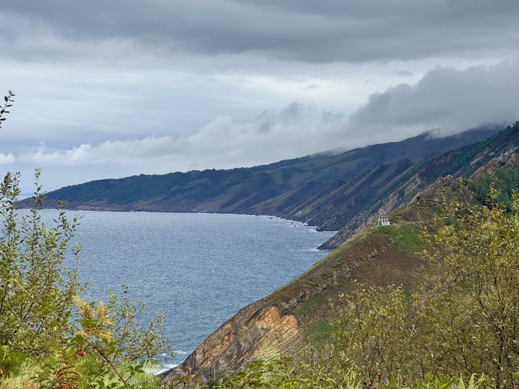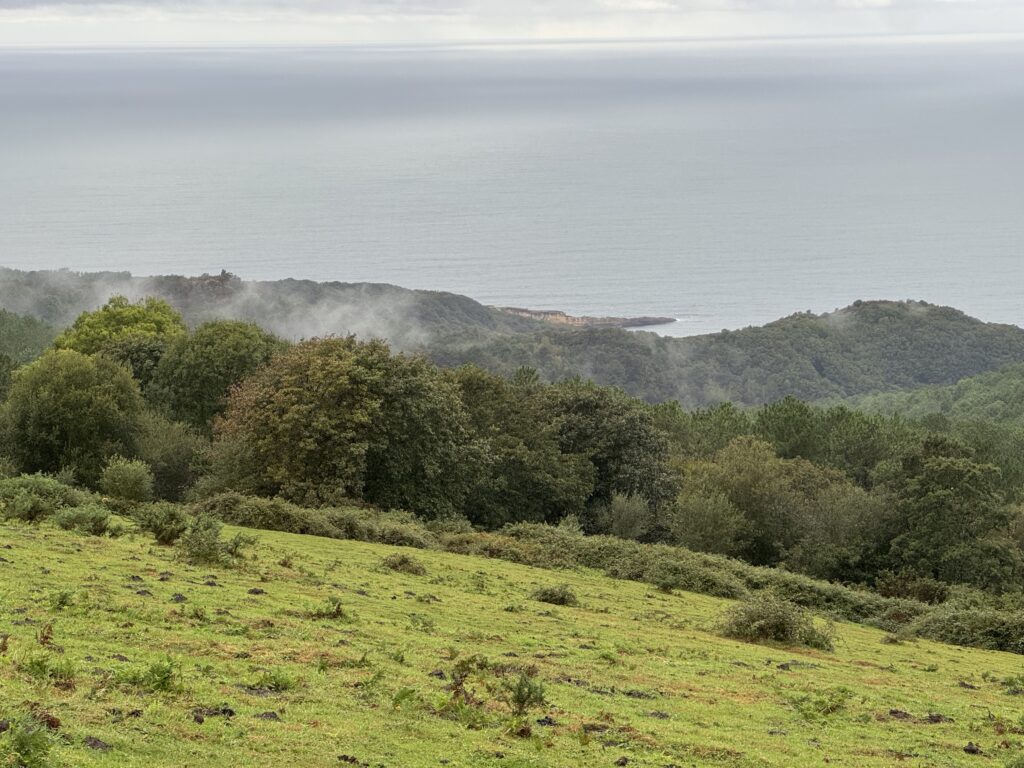 Trotz des starken Regens ist Landschaft atemraubend . Immer wieder öffnet sich der Blick: rechts das Meer, hinter mir Hendaye und Irun, eingerahmt von Wolken und Grau, was auf seine eigene Weise schön wirkt.