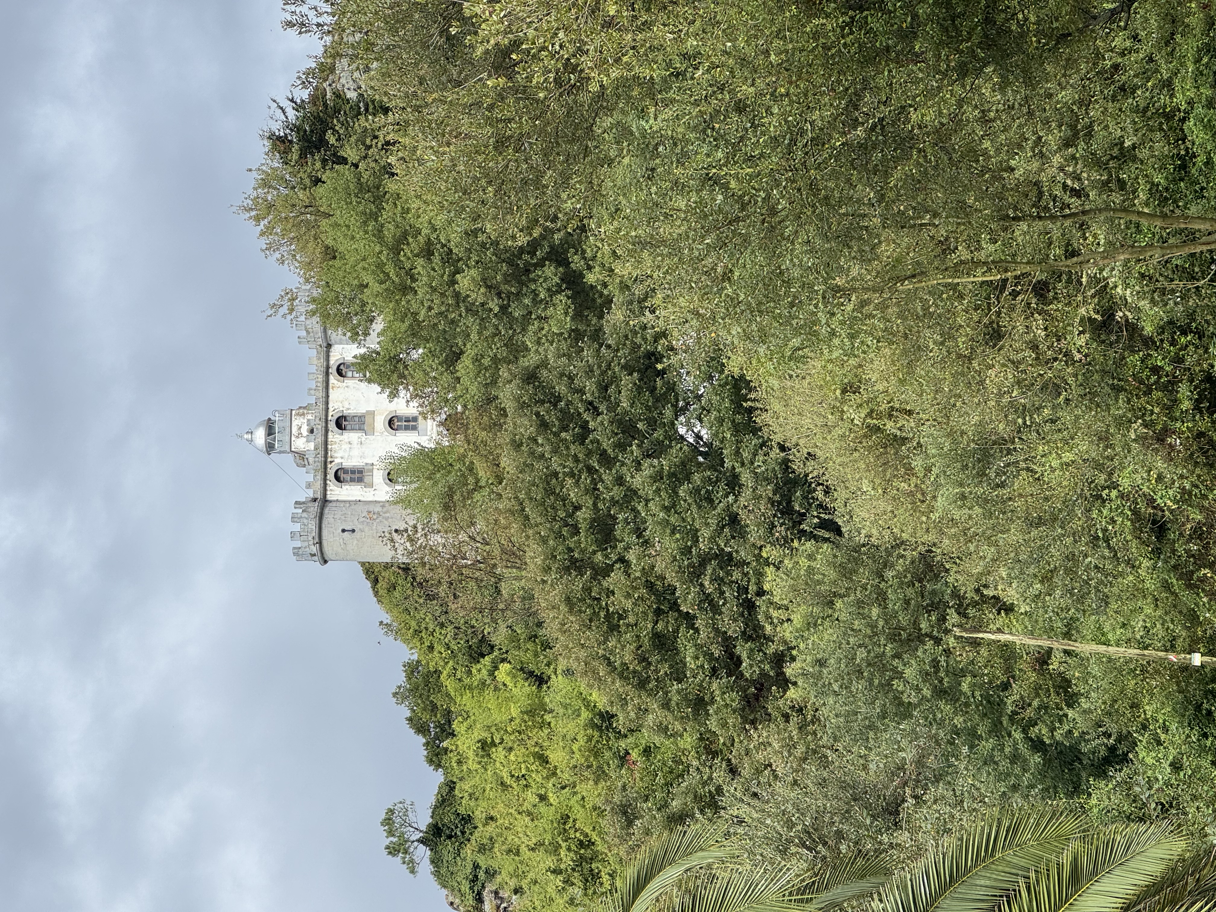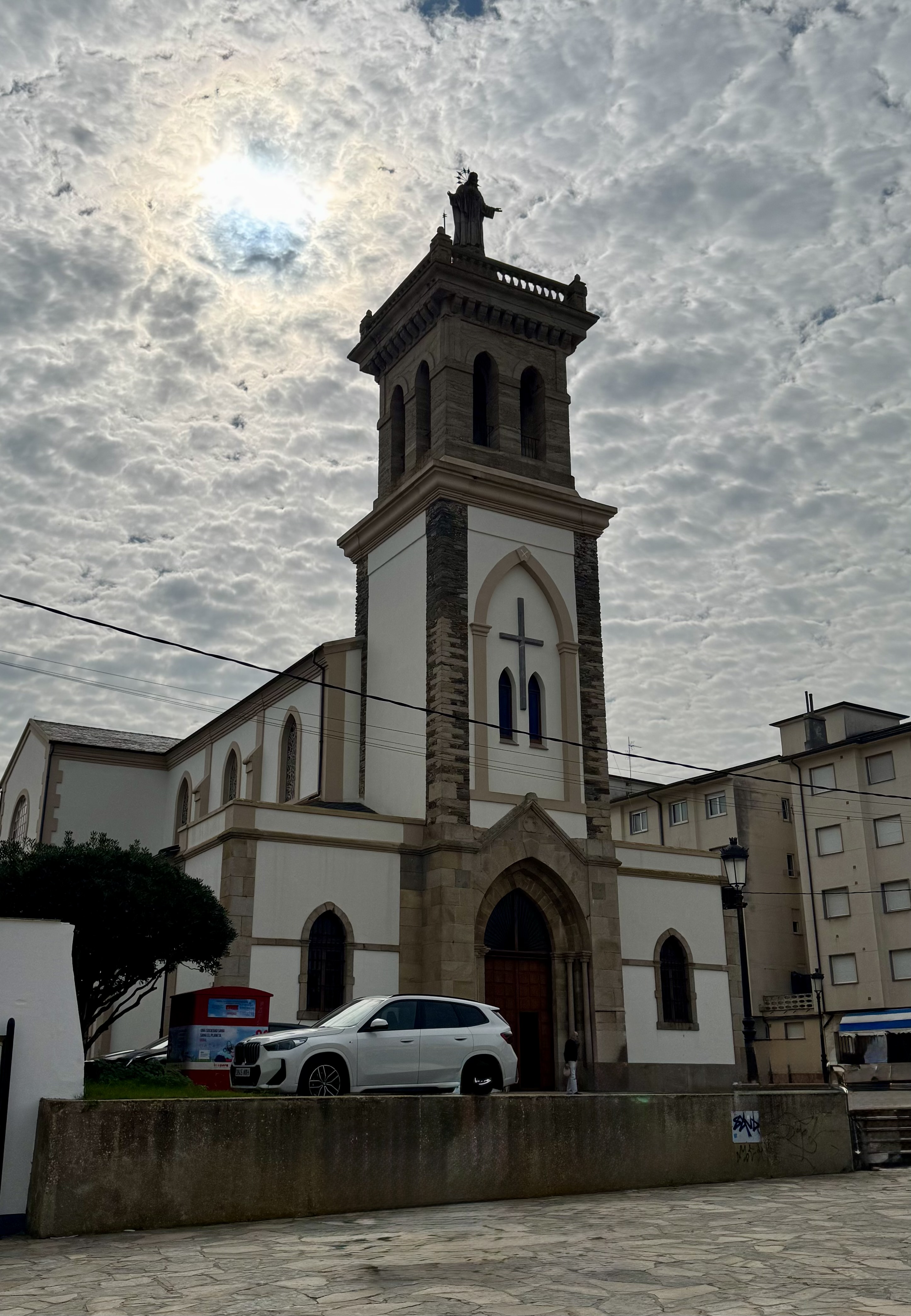 Zwischendurch eine offene Kirche in Tapia de Casariego, mit einer Jesus-Figur auf dem Kirchturm, anstelle eines Kreuzes. Und sie ist offen, heute ist Feiertag im Spanien und Gottesdienst. Ich nutze die Möglichkeit für ein stilles Gebet.