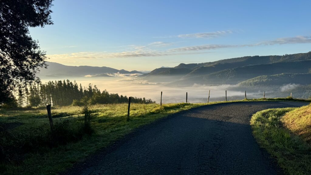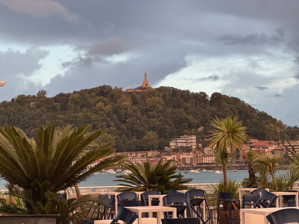 Der Tag beginnt, wie der erste endete – im Regen. Doch schon beim Aufstieg aus der Stadt reißt der Himmel auf, und die Sonne taucht San Sebastián in goldenes Licht.
