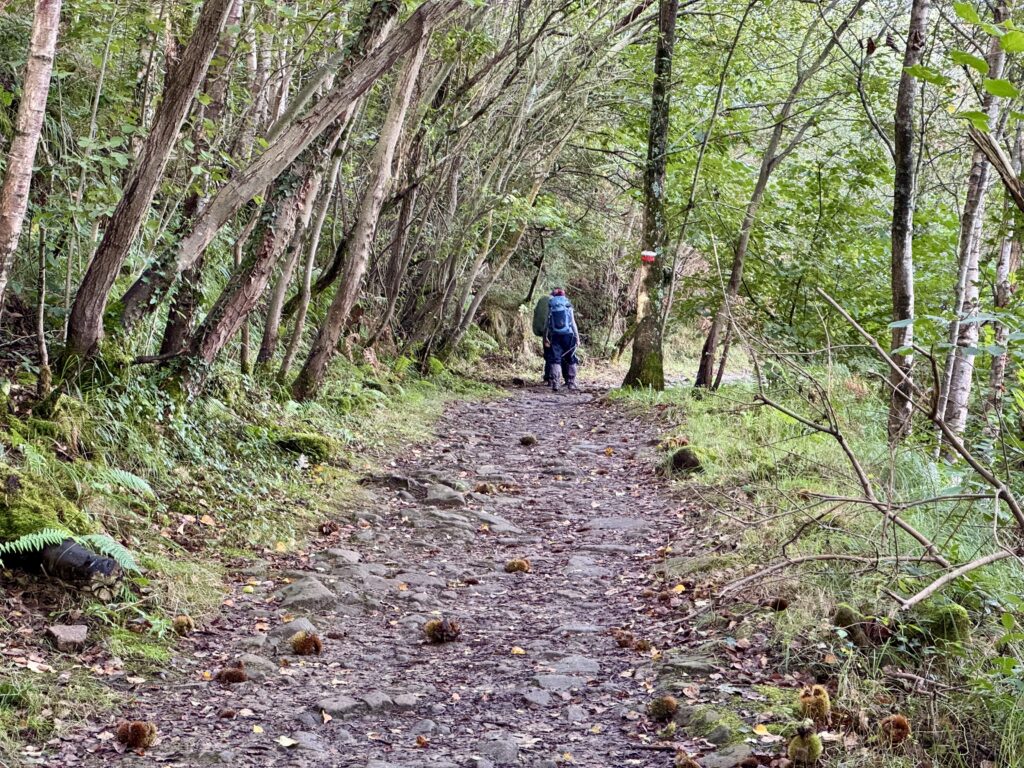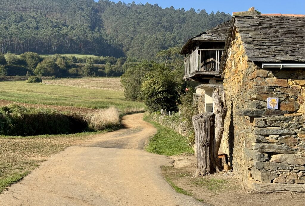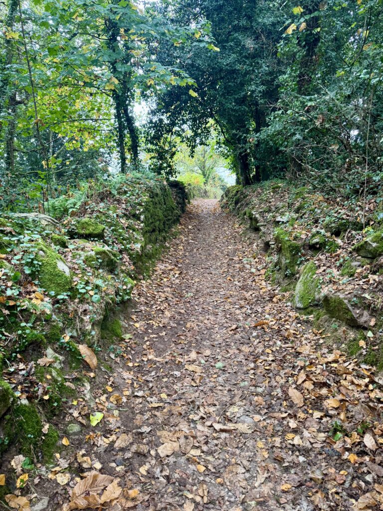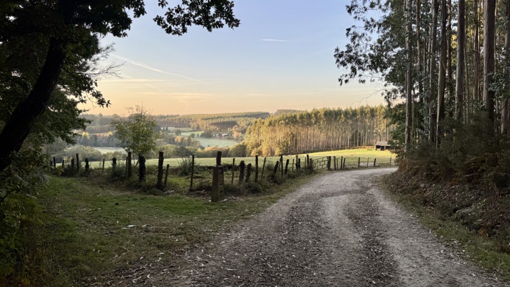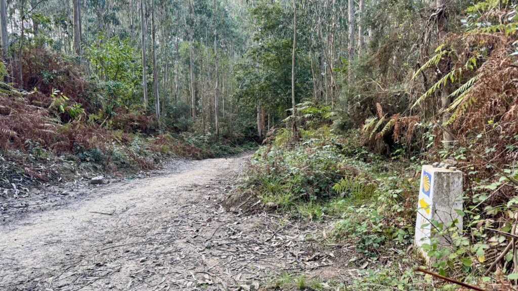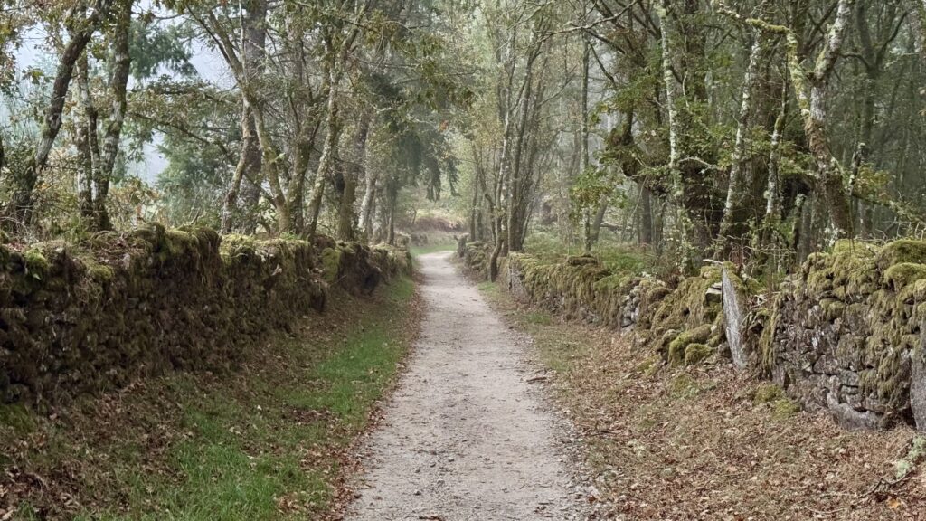 Der heutige Weg bietet alles, was Pilgern ausmacht: Abwechslung, Stille, Anstrengung und kleine Momente der Freude. Der Untergrund wechselt ständig – Waldwege, Schotter, Asphalt, Wiesenpfade – und führt mich stetig in Richtung Sobrado.