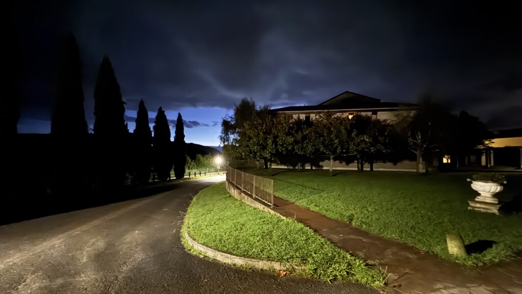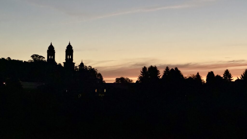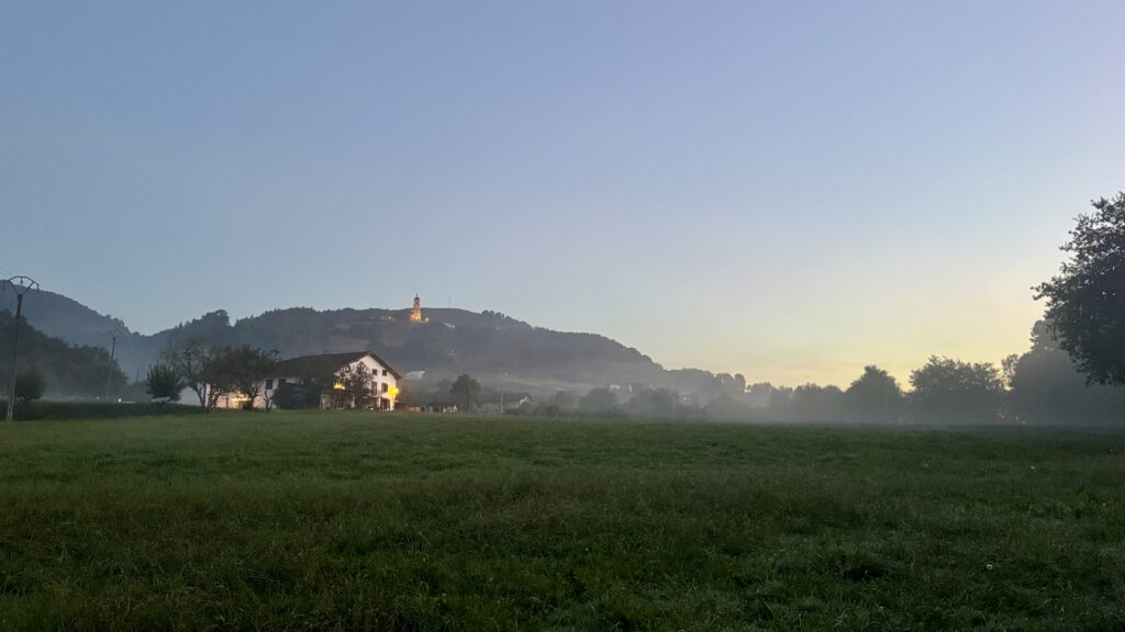 Am frühen Morgen führt mich der Weg zunächst steil durch ein dunkles Waldstück hinab. Im Licht meiner Stirnlampe sehe ich das Schimmern eines weiteren Pilgers etwa fünfzig Meter voraus, was mir ein Gefühl von Gemeinschaft in der Dunkelheit gibt. Kurz darauf passiere ich ein Hotel mit Bar. Der Pilger kehrt ein, ich hingegen gehe weiter – und verlaufe mich prompt zweimal. Glücklicherweise treffe ich drei deutschsprachige Wanderer, die mich auf den richtigen Pfad zurückbringen. So lerne ich eine Pilgerin aus Regensburg kennen, die ebenfalls auf dem Jakobsweg unterwegs ist. Wir verstehen uns auf Anhieb, reden über Gott und die Welt – über Camino-Erlebnisse, Familie, Beruf und Politik – und verpassen dabei gemeinsam eine Abzweigung. Ein klassischer Pilgermoment.