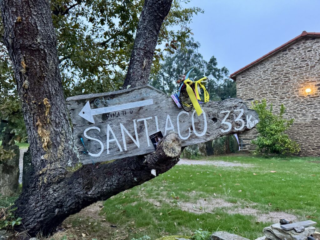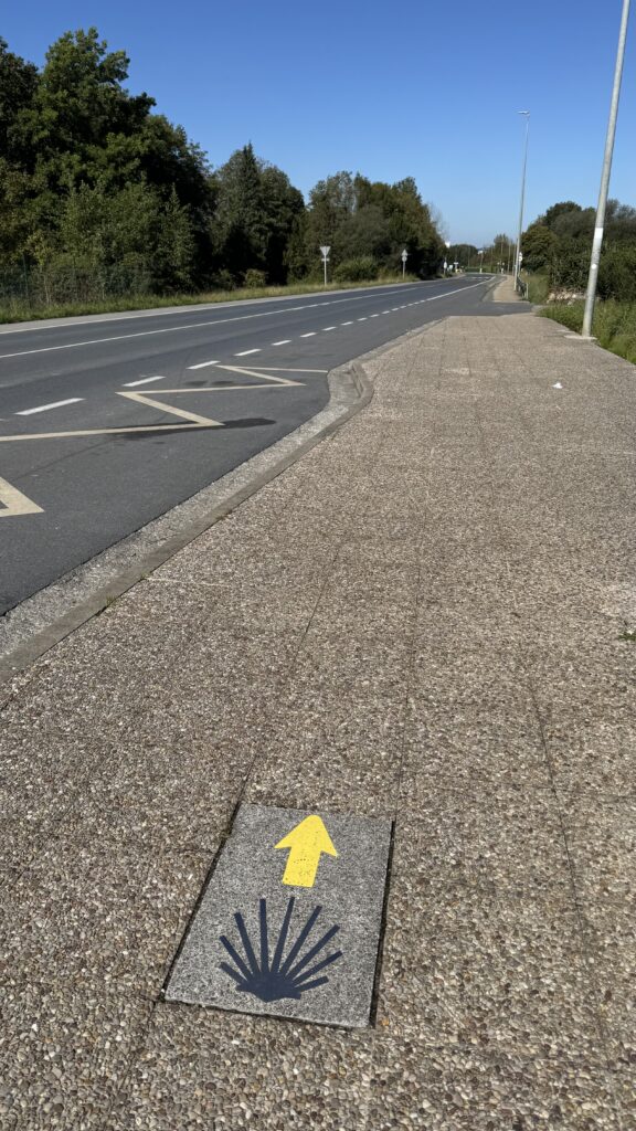 Der Weg führte mich durch kleine Dörfer, vorbei an Feldern und entlang des Flughafens von Santiago. Schließlich begrüßt mich der erste „Santiago“-Stein – ein Moment, der Gänsehaut auslöst.