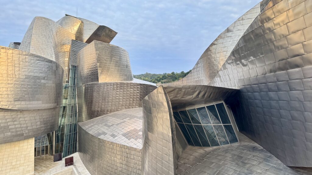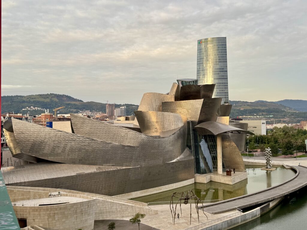 Das Guggenheim ist weit mehr als ein Museum: Schon von außen wirkt es wie eine riesige Skulptur aus Titan, Glas und Stein, die im Morgenlicht leicht golden schimmert. Für einen Besuch im Inneren ist es noch zu früh, doch zwischen Treppen, Wasserflächen und der monumentalen Spinne Maman kann ich spüren, welche Bedeutung Architektur für diese Stadt hat.