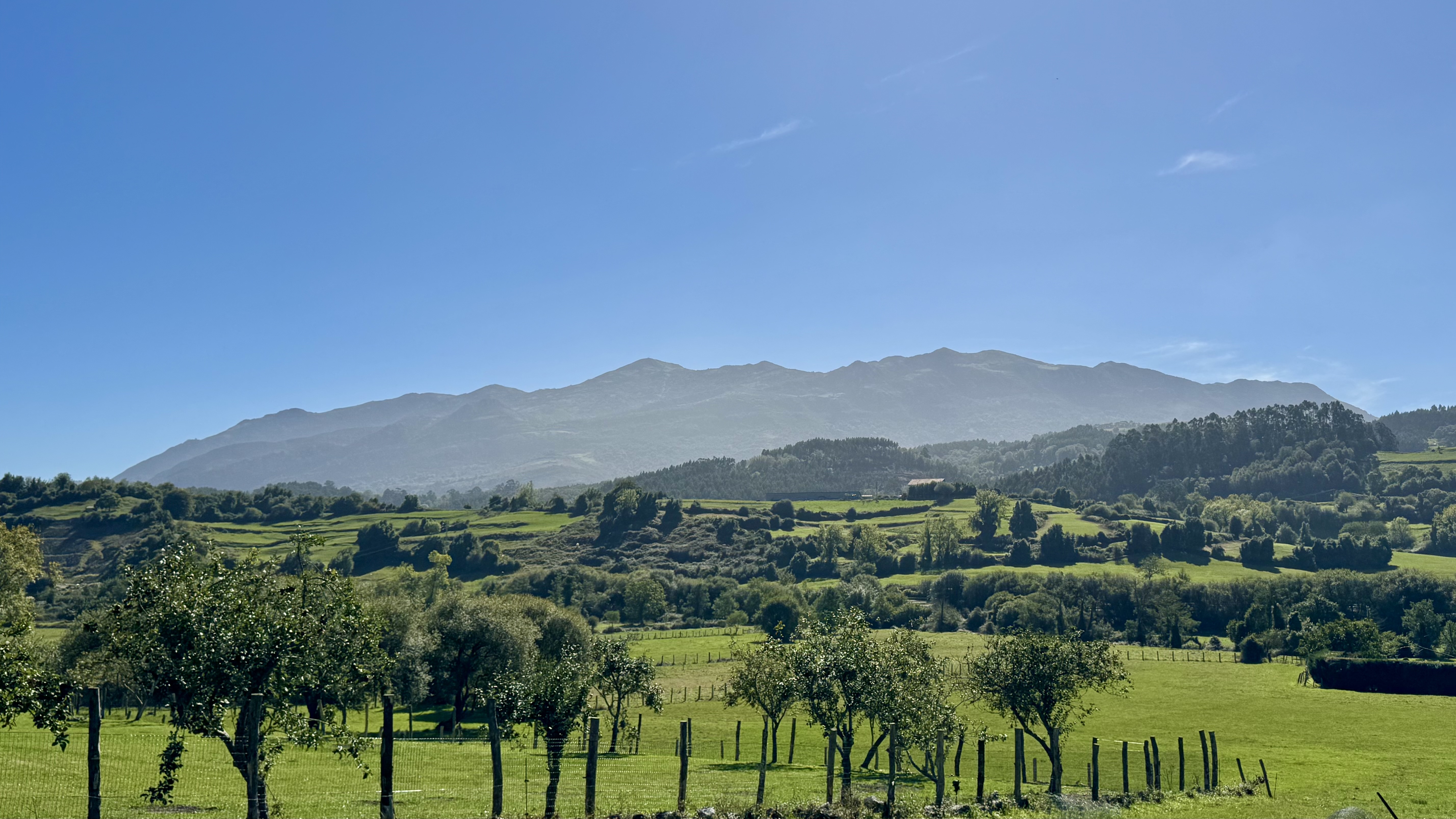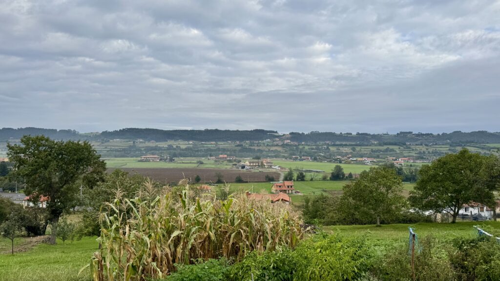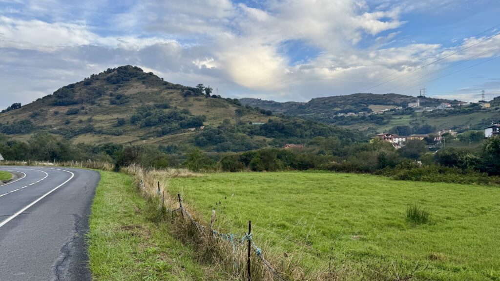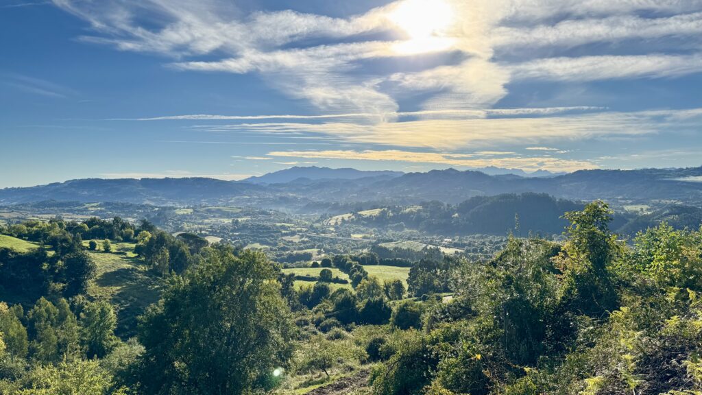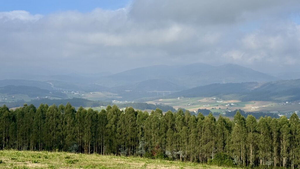 Schon kurz nach Ribadeo verändert sich die Landschaft grundlegend: Die Küste bleibt zurück, stattdessen bestimmen Felder, Wälder und weite Hügel das Bild.