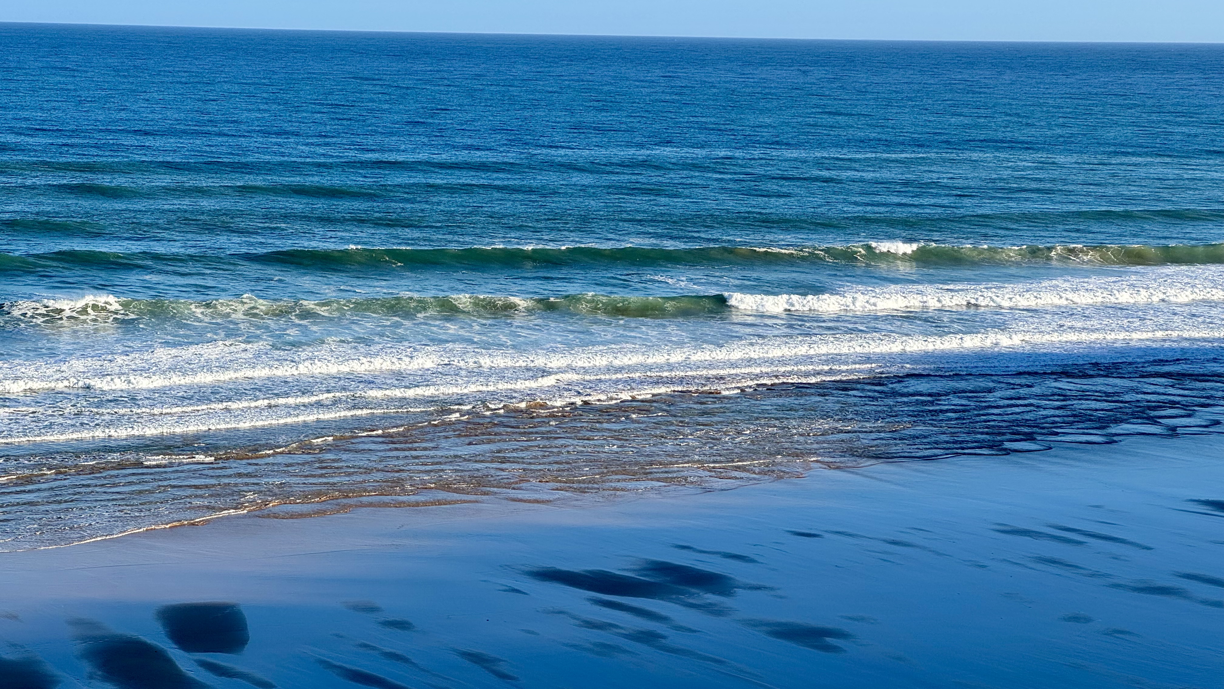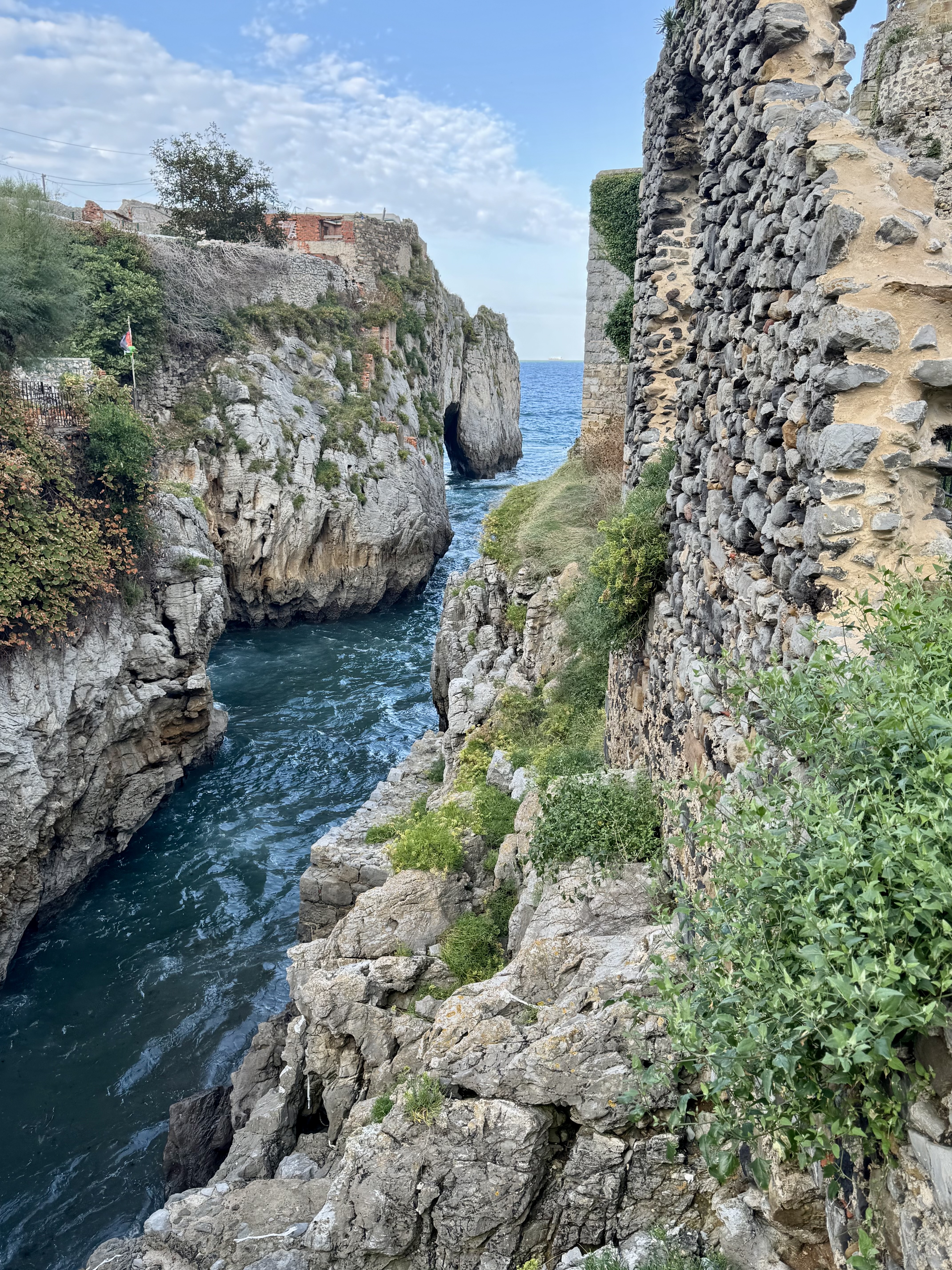 Zunächst begleitet uns die Autobahn, doch bald öffnet sich der Weg wieder zur Küste. Plötzlich liegt das Meer direkt vor uns, wild und weit.