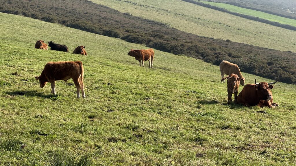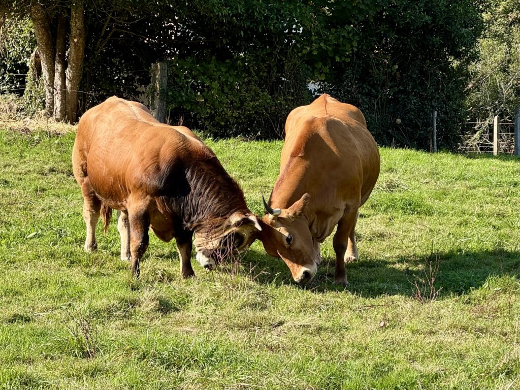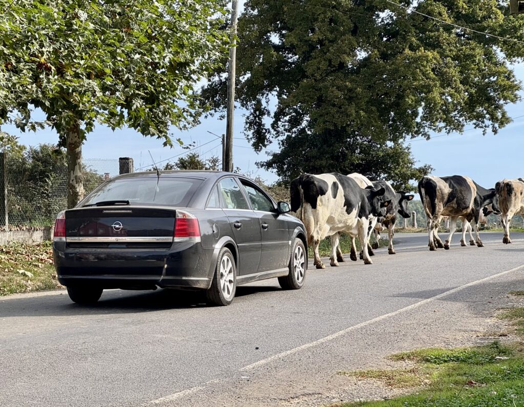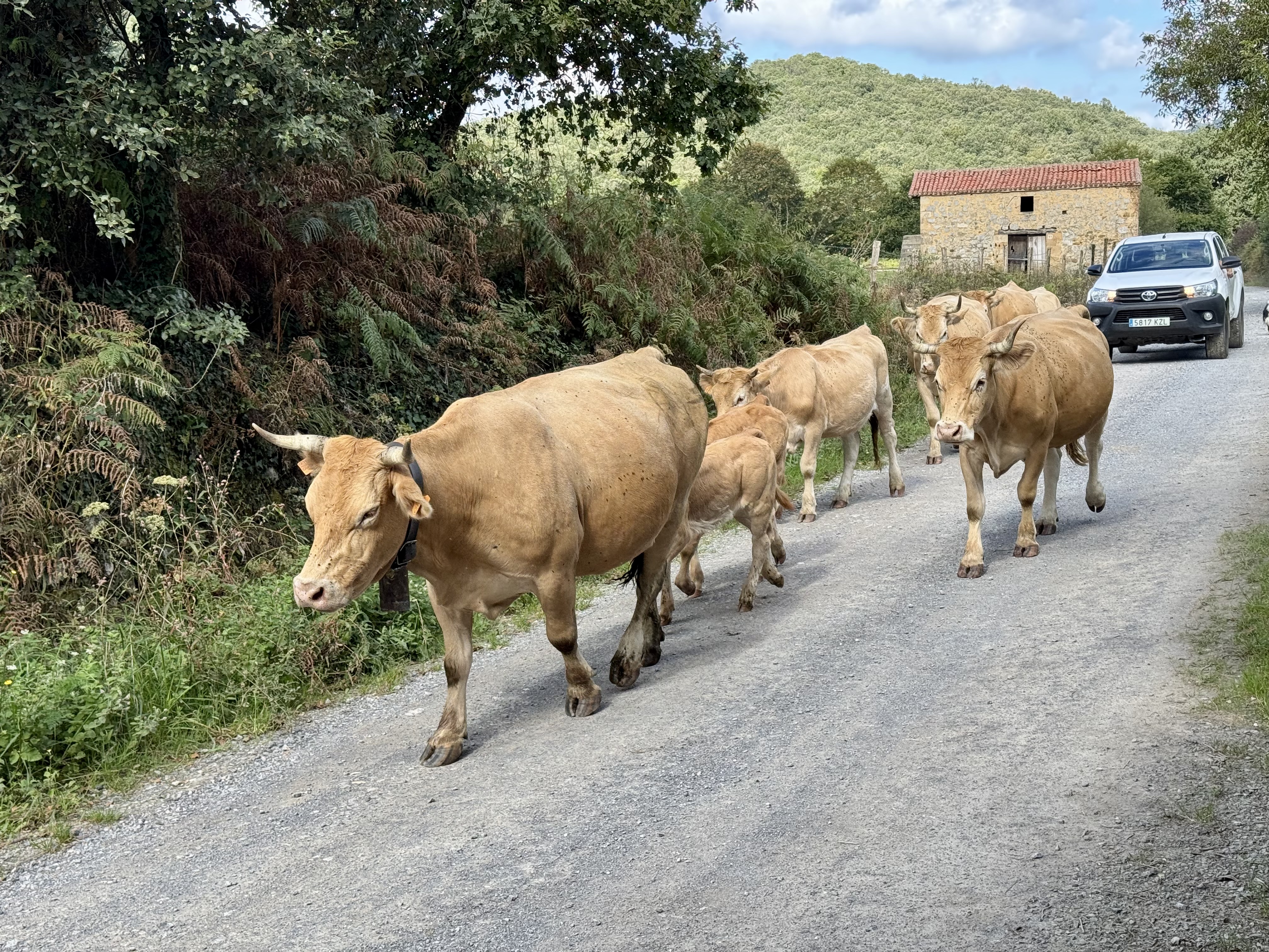 Kurz darauf werden wir Zeugen eines typisch spanischen Spektakels: Eine Herde Kühe wird von der Weide zurück in den Stall getrieben – begleitet von lautem Hupen und der Warnblinkanlage eines PKWs. Effektiv und irgendwie charmant zugleich.