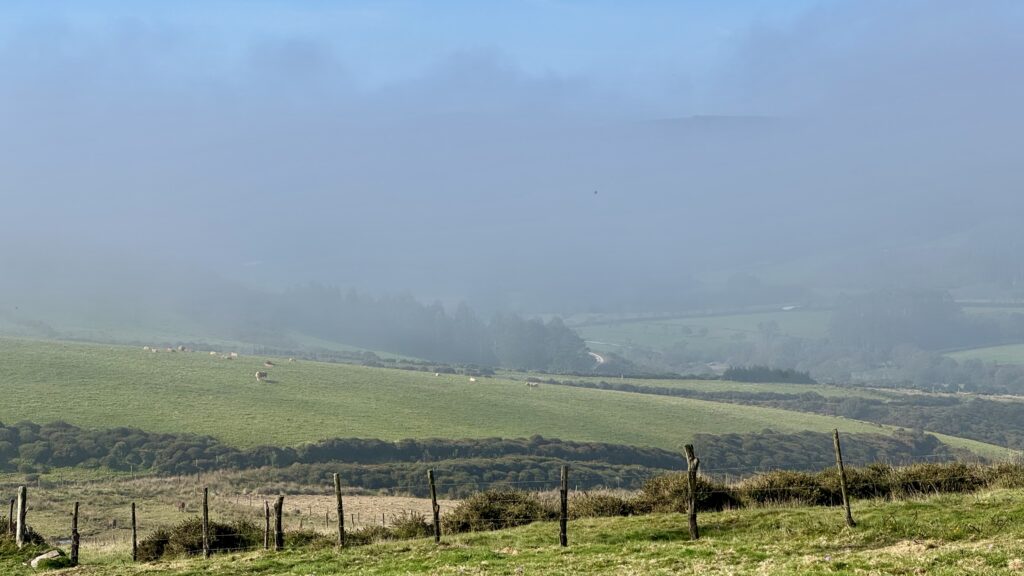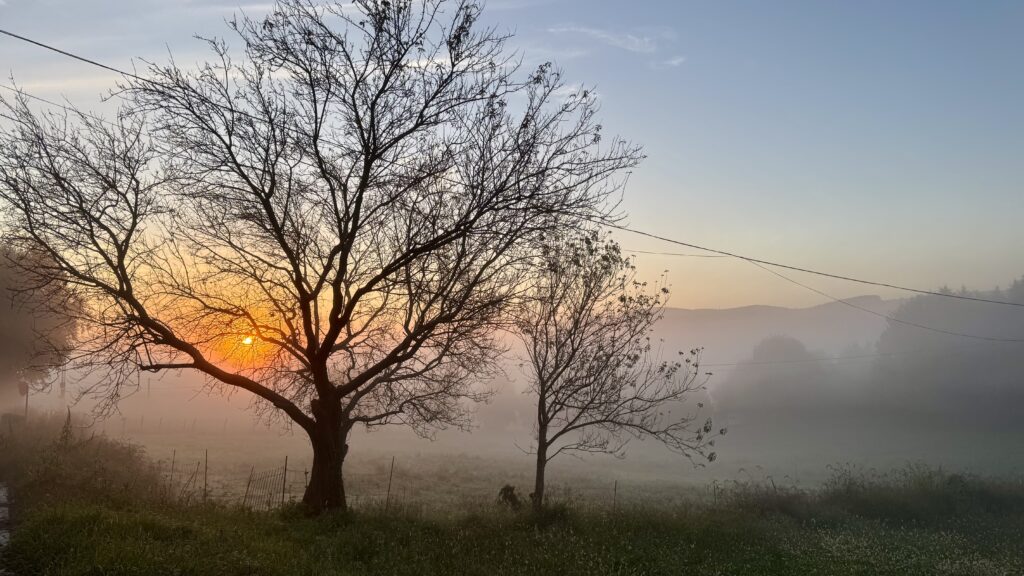 Als sich der morgendliche Nebel schließlich lichtet, öffnet sich der Blick auf eine friedliche, entschleunigte Landschaft, die perfekt zum Nachdenken einlädt.