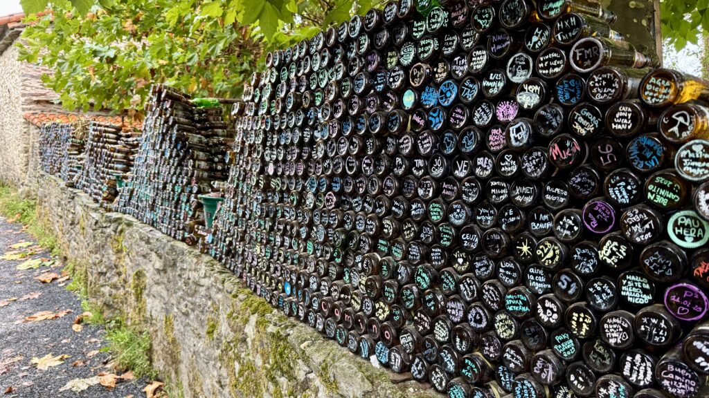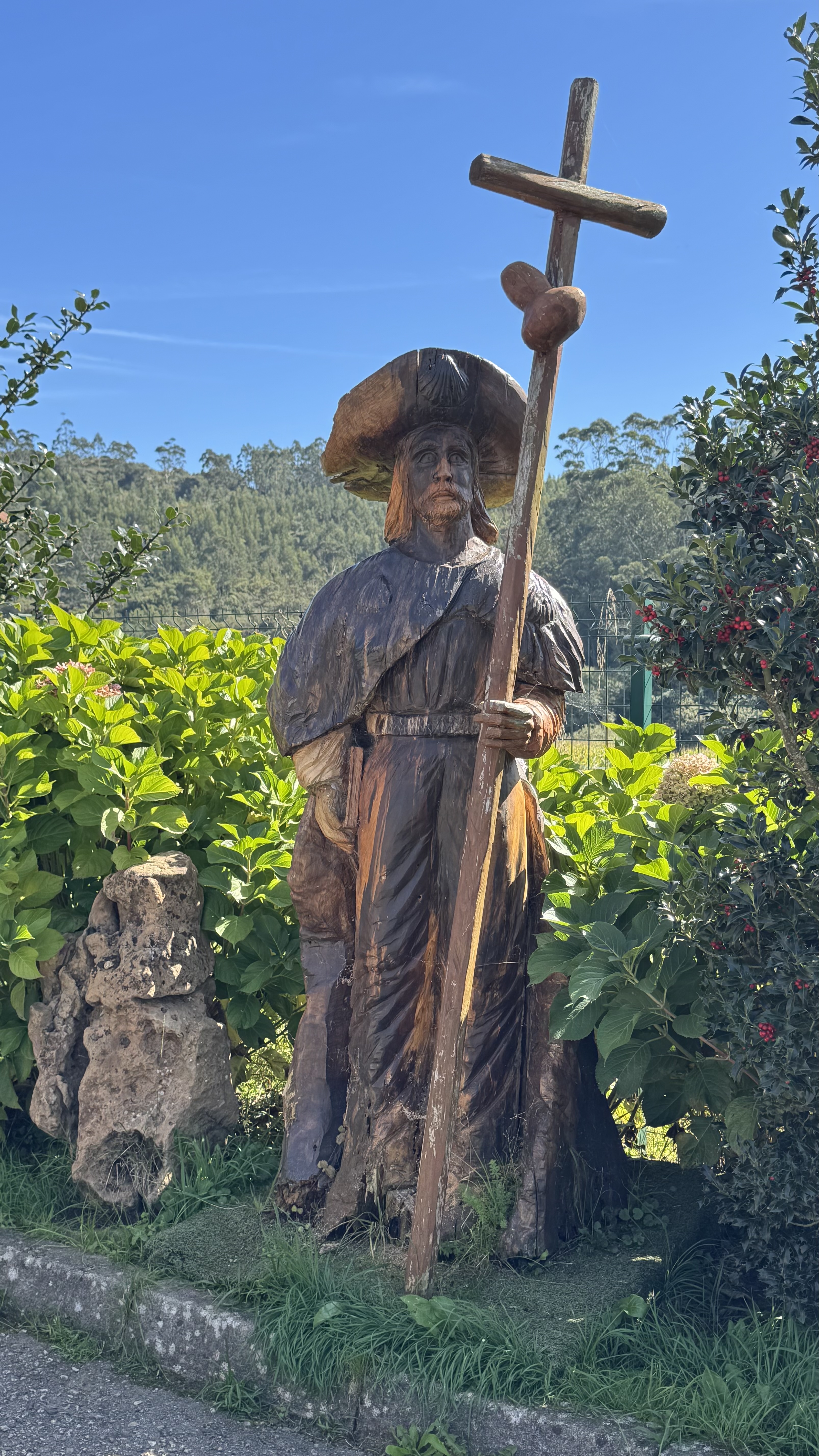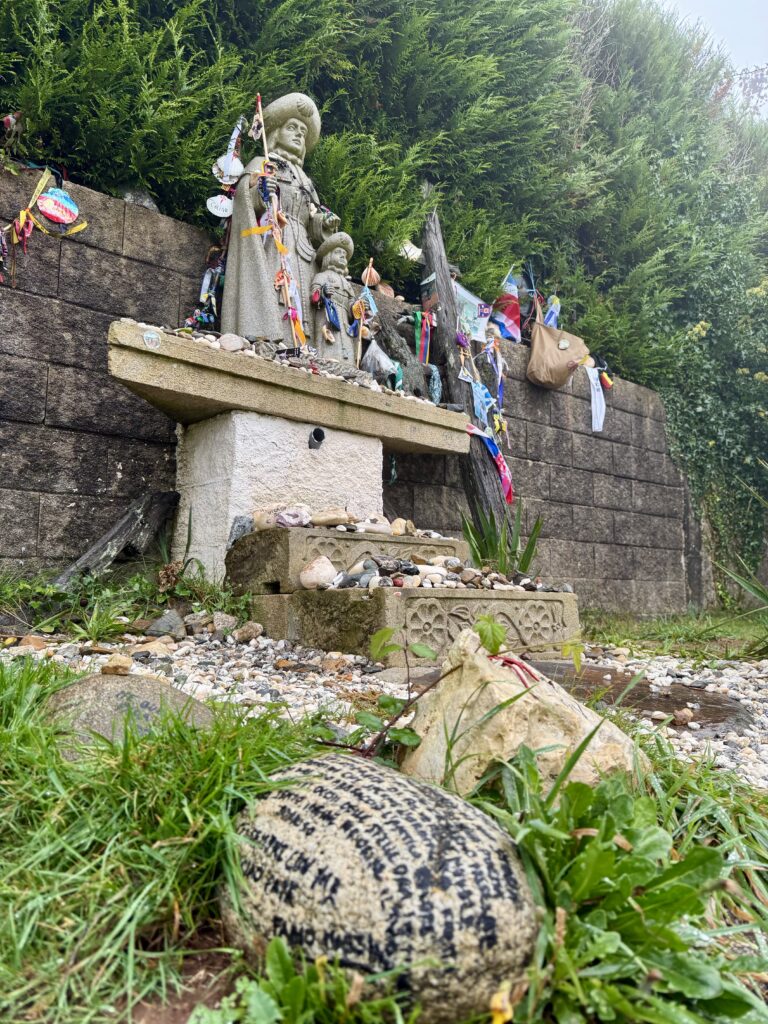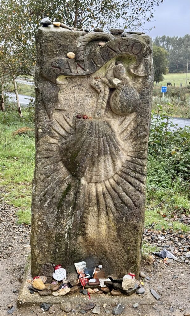 Ich komme an mehreren kleinen Café-Bars vorbei – eine davon wähle ich für meinen letzten Kaffee vor Santiago. Wenig später erreiche ich eine Jakobus-Skulptur, an der Pilger persönliche Botschaften auf Karten und Steinen hinterlassen haben. Ich bleibe stehen, lese einige davon und spürte, wie sich die Stimmung des Abschieds und Ankommens langsam in mir ausbreitete.