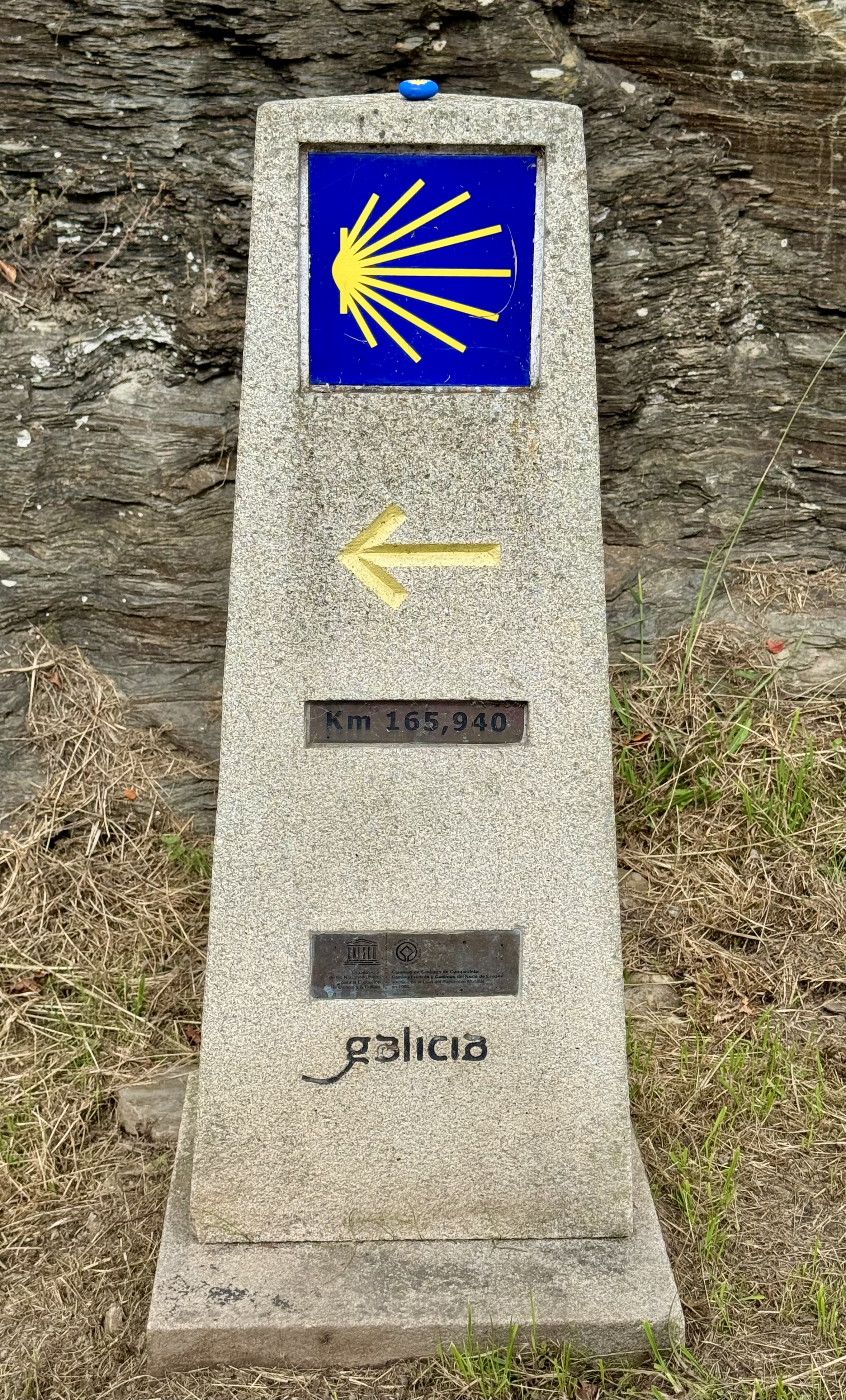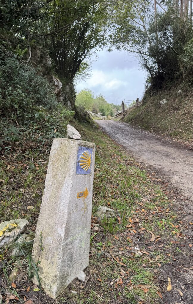 Seit meinem Eintritt in Galicien begegnen mir nun die typischen gelben Markierungssteine, auf denen nicht nur die Muschel prangt, sondern auch die verbleibende Entfernung bis Santiago de Compostela angegeben ist.