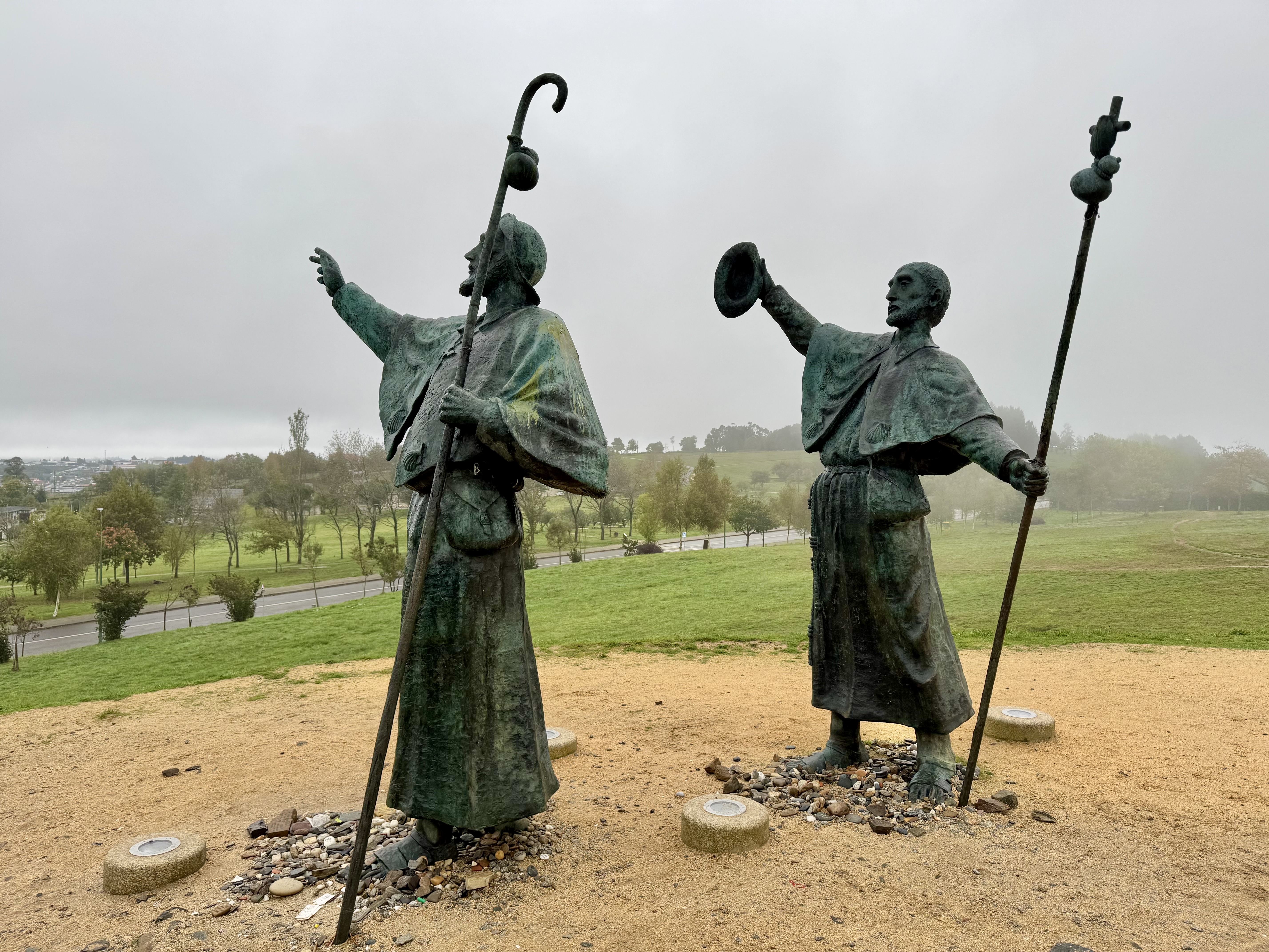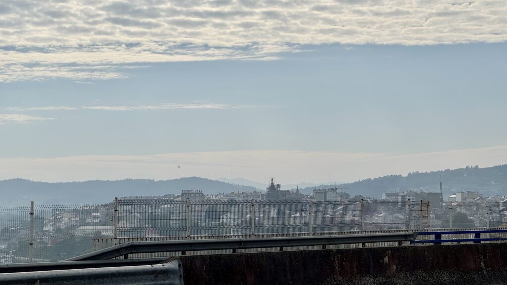 Mein Zwischenziel ist der Monte de Gozo, der „Berg der Freude“. Hier stehen die beiden bekannten Pilgerfiguren, die in Richtung der Kathedrale zeigen – und ich verstehe plötzlich, warum dieser Ort so heißt. Es ist ein Moment der Rührung, des Loslassens und der Dankbarkeit. Ich lege meine eigene Karte mit einer kleinen Botschaft ab, verweile still, atme tief durch – und fühle mich leichter. Fünf Kilometer liegen noch vor mir.
