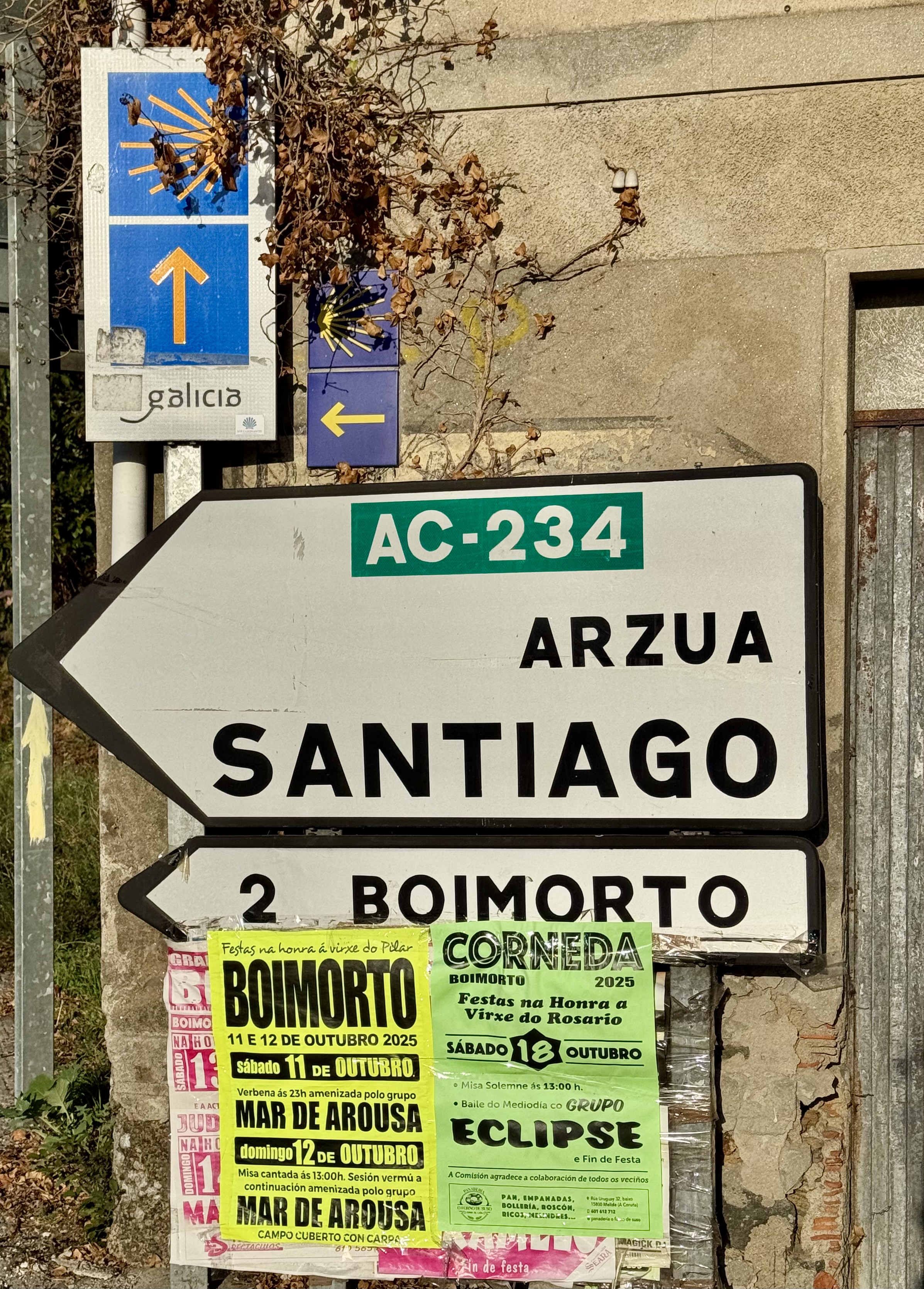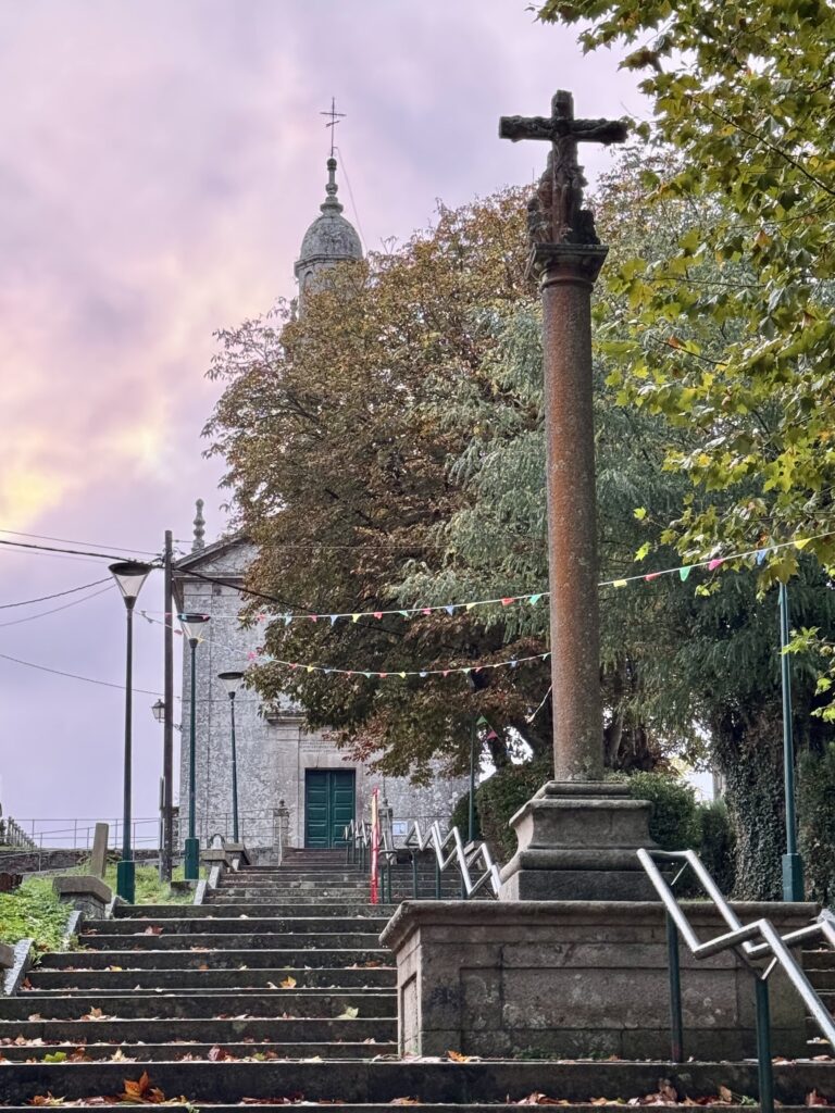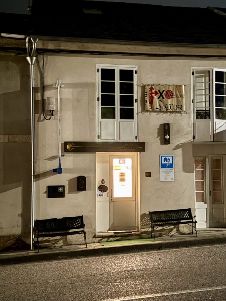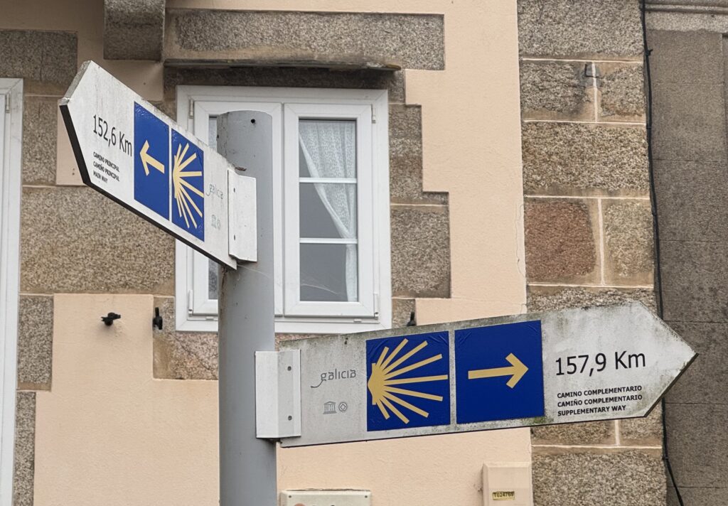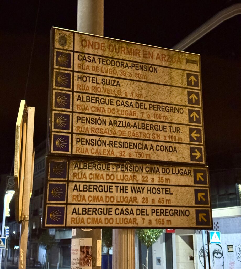 Gestern Abend machte ich noch einen kleinen Spaziergang durch Arzúa – und war überrascht, wie sehr hier alles vom Jakobsweg geprägt ist. Die Stadt lebt von den Pilgern: Überall findet man Wegweiser zu Herbergen, Restaurants und Bars, Souvenirläden mit Muscheln und Pilgerkreuzen, und auf den Straßen sieht man Menschen in Funktionskleidung und Badeschlappen. Der Camino ist hier kein Geheimtipp mehr – er ist das Herz der Stadt.