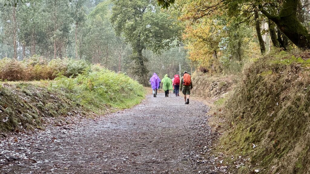 Der Regen setzt früh ein, doch er stört weder mich noch die anderen Pilger. In bunten Ponchos stapfen wir alle unbeirrt weiter – jeder in seinem eigenen Rhythmus, mit einem gemeinsamen Ziel.