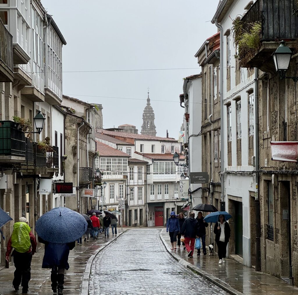 Zugleich fehlt mir die Lust, noch vier weitere Tage dranzuhängen und bis nach Finisterre zu laufen. Das Wetter soll kippen, mit Regen und Gewitter – keine verlockende Aussicht. Also beschließe ich, mich auf mein ursprüngliches Ziel zu konzentrieren: Santiago de Compostela.